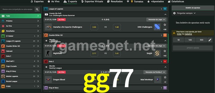 O gg77 oferece uma grande seleção de opções de apostas em e-sports com probabilidades competitivas